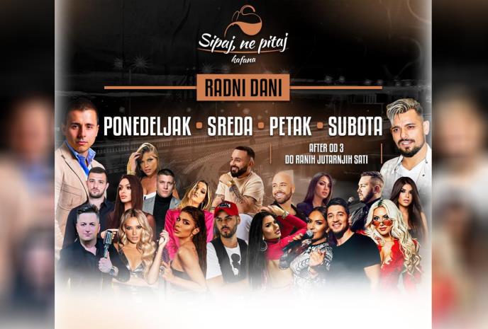 Jedna od najpopularnijih kafana u Beogradu garantuje sjajnu zabavu po čemu je nadaleko poznata. Posle kraće pauze, vraćaju se sa sjajno osmišljenim programom. Svi oni koji žele da uživaju u odličnoj svirci mogu da se odluče za kafanu "Sipaj, ne pitaj", jer sad radi u još jačem sastavu, a vrata svojim gostima otvara ponedeljkom, sredom, petkom i subotom. Takođe, svakog petka i subote biće upriličen "After Party" od tri sata iza ponoći pa do ranih jutarnjih sati.