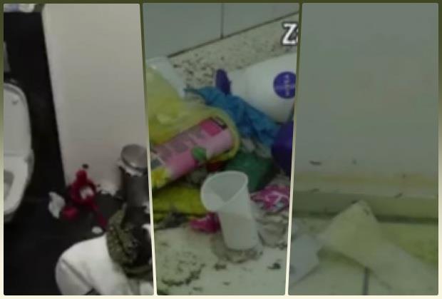 Na snimku se jasno vidi gomila iskorišćenih papirnih maramica u ćošku pored WC šolje i puna kanta za smeće. Limenke i ambalaže razbacane su svuda su po podu, kao i prljava odeća zadrugara oko tuš kabine.