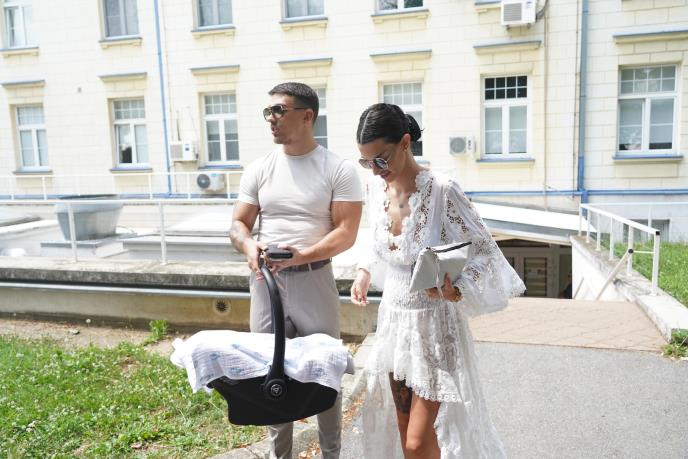 Nju su ispred porodilišta sačekali partner, kao i njegova porodica, odnosno svekrva, a Tara je bila nasmejana i srećna.