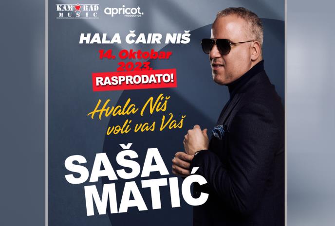 Folk zvezda Saša Matić rasprodao je halu Čair u Nišu, za koncert koji će biti održan 14. oktobra u 20 časova pod sloganom "Samo ovu noć".