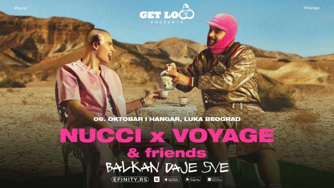 Popularan dvojac čije su numere godinama unazad neprikosnovene himne mlađih generacija, od 20 časova u Hangaru Luke Beograd priprediće nezaboravan šou pod nazivom Nucci x Voyage & Friends: „Balkan daje sve“, koji će biti ispunjen antologijskim rimama i prepoznatljivim bitovima, dok će revolucionarna audio-video produkcija postaviti nove standarde u live industriji i u potpunosti promeniti definiciju koncertnog iskustva. Koncert je najavljen kao oda Beogradu, domaćoj publici i generacijama uz koje je ovaj duo odrastao u novobeogradskim blokovima, kreirajući svojevrsnu antologijsku priču za sugrađane glavnog grada.