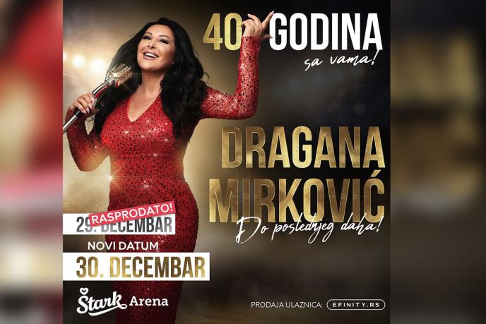 Manje od tri nedelje bilo je dovoljno Dragani Mirković da bez reklame rasproda koncert 29. decembra u Štark areni, a zbog nesmanjenog interesovanja i na zahtev fanova odlučila je da zakaže i drugo druženje sa publikom.