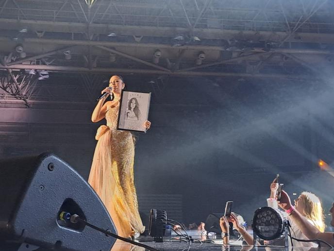 Duga bež haljina sa kristalima oduševila je sve prisutne, a Aleksandra je odmah i dobila poklon od najvetranijih fanova njen portret.