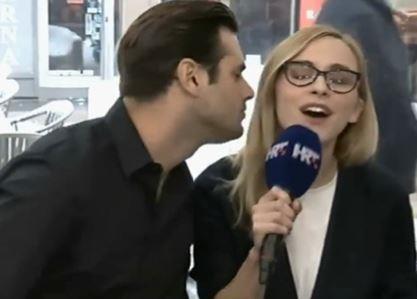 On se sve vreme približavao reporterki, mirisao joj kosu, grlio je i ljubio je u obraz. Kako je i samoj novinarki bilo neprijatno, nije znala kako da se ponese u ovoj situaciji.