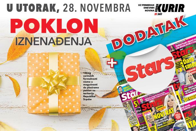 U utorak, 28.novembra uz dnevne novine Kurir vas čeka POKLON IZNENAĐENJA. Možete izabrati: kašiku za pirinač, samolepljivu silikonsku kukicu, kašiku za sos, četku za pse, šrafciger, rajf, ljuštilicu, pepeljaru, štapiće za uši, osveživač prostora, otvarač za flaše, četkicu za premazivanje, rende, ašov, kašičicu, vadičep, držač za sapun, hvataljku za led, držač za kablove, mericu, sunđer, teflon traku i još mnogo toga.