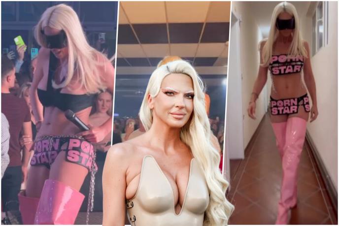 Tako je i ovaj put izašla pred publiku u izazovnom pink kostimu koji je otkrio njenu fantastčnu liniju, a svima je paralo oči naziv koji je bio ispisan ogromnim slovima "Porno star", neki su takođe komentarisali i čizme koje su dodatno upotpunile njen stajling.