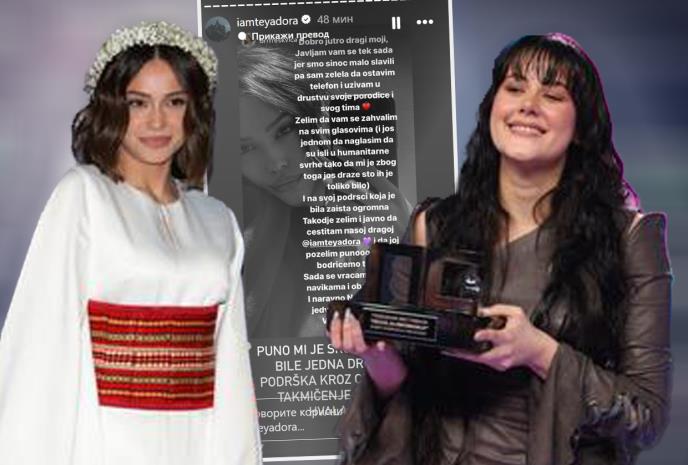 -Dobro jutro dragi moji. Javljam vam se tek sada jer smo sinoć malo slavili, pa sam želela da ostavim telefon i uživam u društvu svoje porodice i svog tima. Želim da vam se zahvalim na svim glasovima (i još jednom da naglasim da su išli u humanitarne svrhe tako da mi je zbog toga još draže što ih je toliko bilo), i na svoj podršci koja je bila zaista ogromna. Takođe želim i javno da čestitam našoj dragoj Teya Dori i da joj poželim puno sreće, bodrićemo te svi. Sada se vraćamo starim navikama i obavezama i naravno nastupima. Jedva vas sve čekam. Voli vas vaša Breskva- napisala je Breskvica.