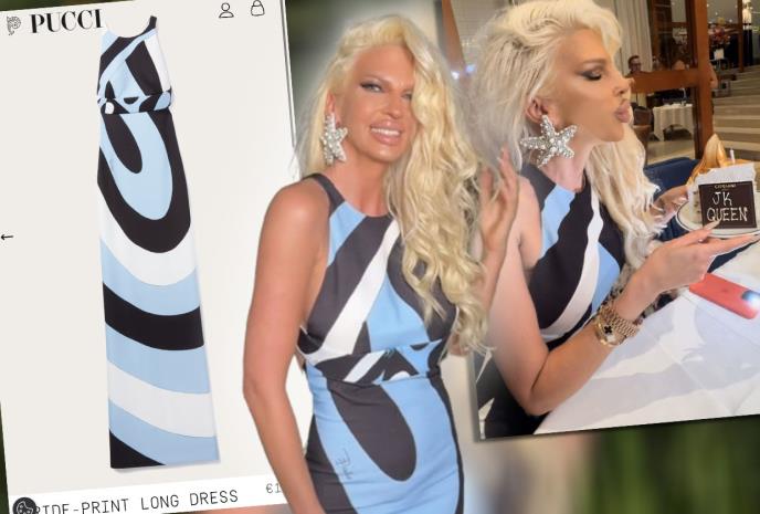 Ovom prilikom Jelena je odabrala dugu haljinu na bretele zanimljivog printa brenda “puči” od 1.400 evra, koju je uparila sa zanimljivim minđušama u obliku morske zvezde i tašnicom u obliku bisera.