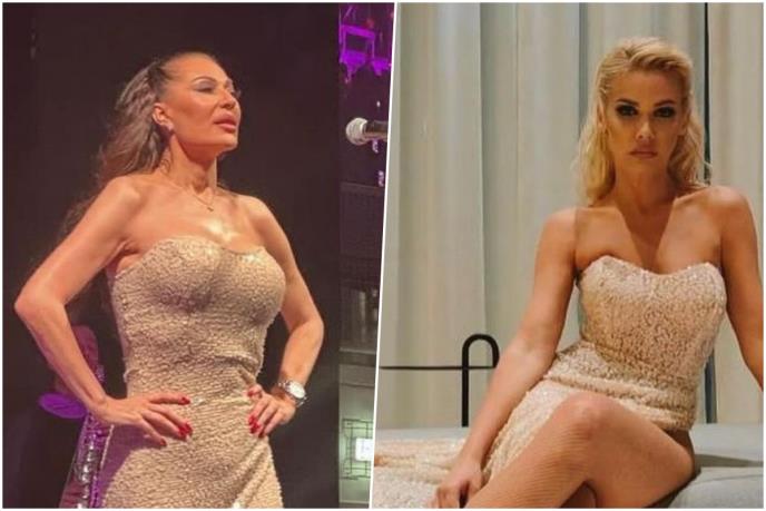 U pitanju je haljina poznate domaće dizajnerke čija je cena 600 evra. Ovu kreaciju koja prati liniju tela, Ceca je sredinom marta ponela na nastupu u Mariboru, dok je s druge strane, Nataša za potrebe snimanja odabrala identičnu haljinu ispod koje je, za razliku od starije koleginice, obula mrežaste čarape.