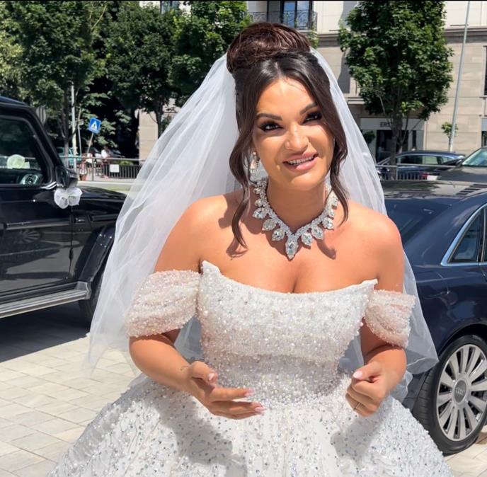 Mlada je blistala u nestvarno lepoj beloj velikoj i teškoj venčanici optočenoj kristalima i šljkokicama bez ramena, uz koju je ukombinovala raškošni glomazni šik nakit - ogrlicu i minđuše.