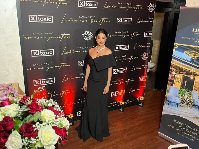 Tanja večeras blista u dugoj crnoj haljini, a sve to je uklopila sa šljaštećom ogrlicom na kojoj su cirkoni koji imitiraju dijamante sa velikim crvenim srcem.