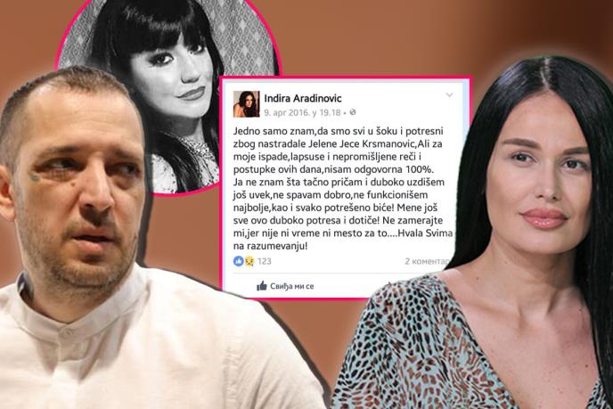 - Jedno samo znam, da smo svi u šoku i potreseni zbog nastradale Jelene Jece Krsmanović. Ali za moje ispade, lapsuse i nepromišljenej reči i postupke ovih dana nisam odgovorna 100 posto. Ne znam šta tačno pričam i duboko uzdišem još uvek. Ne spavam dobro, ne funkcionišem najbolje kao i svako potreseno biće. Mene još sve ovo duboko potresa i dotiče. Ne zamerajte mi, jer nije ni vreme ni mesto za to. Hvala svima na razumevanju - napisala je tada Indi.
