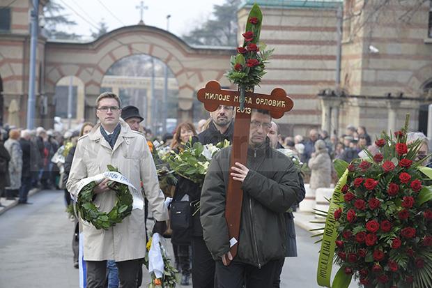 Nekoliko stotina Beograđana okupilo se juče ispred kapele na Novom groblju da oda poslednju počast Miloju Mići Orloviću. Uz kolege sa RTS i javne ličnosti, od Miće su došli da se oproste i brojni obični građani, uglavnom stariji Beograđani.Nakon opela, ispred kapele od legendarnog voditelja prigodnim rečima oprostili su se Kamenko Katić i Bojana Andrić, urednica emisije "Trezor".