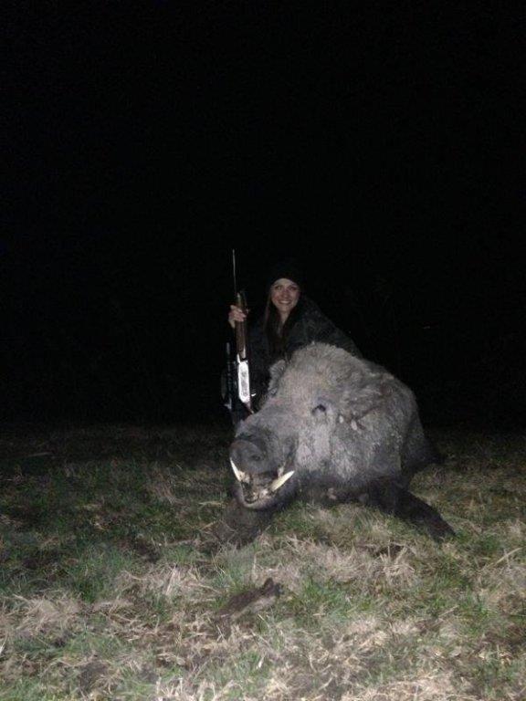 "Trofej u zlatu. Oborio ga je 1 metak kalibra 30 - 06 na 175 metara! Moj najveći ulov do sad.", napisala je pevačica koja na fotografiji čuči pored mrtve divlje svinje, drži pušku obučena u vojničku uniformu.