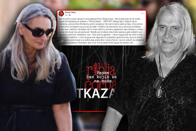 - Dragi prijatelji, obraćamo vam se povodom stopiranja projekcije filma pod nazivom “Riblja Čorba - pesme bez kojih se ne može”. Primetili smo 1.10. objavu na fb u kojoj se navodi da će se film “Riblja čorba - pesme bez kojih se ne može” emitovati na festivalu Dok’n’ritam dana 2.10.2024. godine u Beogradu. Pored Borine porodice ni mi, članovi grupe Riblja čorba, nismo bili obavešteni o projekciji filma. Takođe nismo pogledali film niti smo bili pozvani na projekciju.