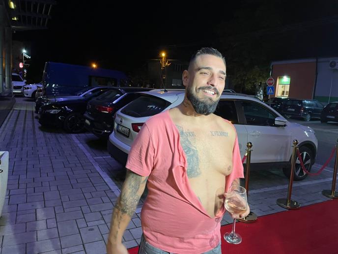 U jednom trenutku, držeći čašu u ruci i pocepan Darko je govorio za medije.