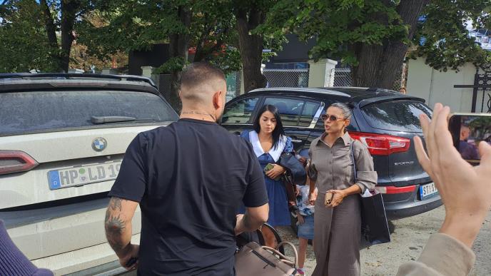 Pevač je danas došao po svoje devojke ispred bolnice, vidno raspoložen i nasmejan u društvu svastika. U ruci je imao bronzanu kolevku za malenu Srnu sa koje niko nije skidao pogled.