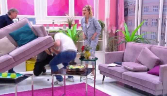 Voditeljka nije u momentu znala kako da reaguje, a zaposleni su odmah pritrčali u pomoć kako bi namestili kauč.