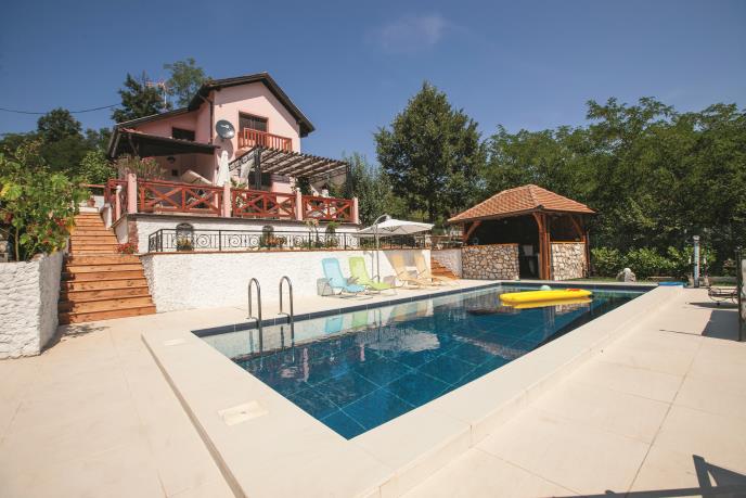 Inače, kuća ima predivan pogled, u dvorištu se pored ogromnog bazena nalazi i luljaška, mali letnjikovac, sto, a raznoliko cveće dalo je svemu posebnu čar.