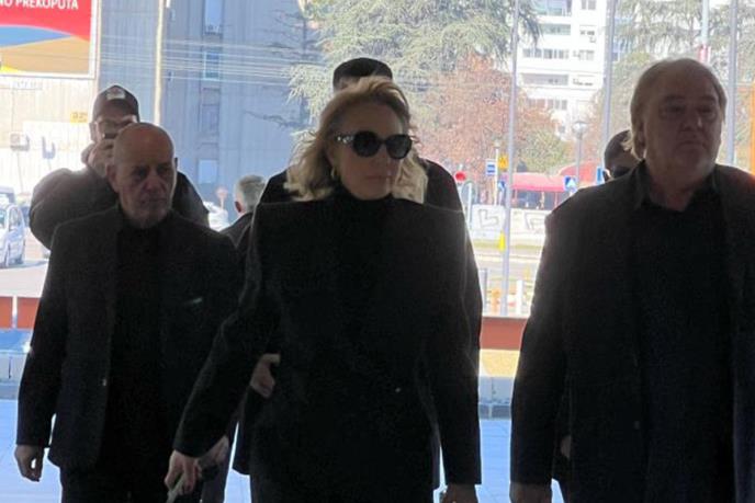 Pevačica zavijena u crno i vidno potrešena stigla je sa suprugom Bobom Živojinovićem i sinom Viktorom. Porodica Živojinović zauzela je svoje mesto u sali gde će zajedno sa porodicom Popović odati poslednju počast estradnom magu.