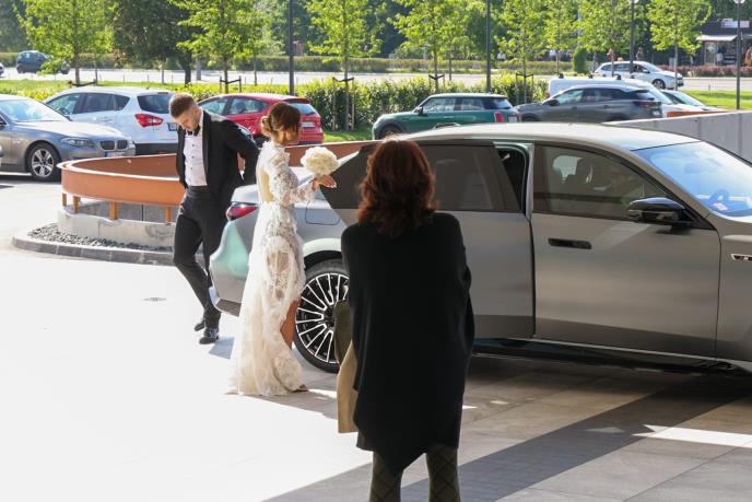 Svadbena ceremonija održava se u elegantnoj svečanoj sali Sava centra, a par je ovom posebnom danu posvetio maksimalnu pažnju – od izbora muzike, dekoracije do menija i protokola. Nasa ekipa je na licu mesta. Mladenci su stigli oko šesnaest časova, a gosti su počeli da priztižu.
