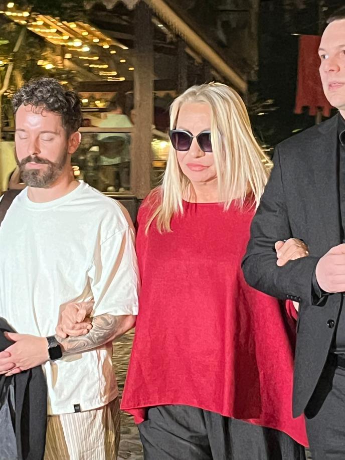 VESNA ZMIJANAC U HIT STAJLINGU ZA KAFANU! Pridržavaju je dva muškarca, a ona sa sunčanim naočarima (FOTO)