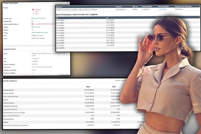 Slična situacija bila je i tokom ranijih godina. Pregled poslovnih knjiga pokazuje da je Dijanin sunovrat počeo još 2022, od kada je krenuo pad prihoda njene firme. Te godine ostvarila je prihod od 720.000 evra, ali su rashodi bili veći - 778.000 evra. Gubitak na kraju 2022. iznosio je 59.000 evra. Još gore je prošla tokom 2023. Tada je firma "Diline d.o.o." prihodovala 527.000 evra, rashod je bio 610.000, pa je gubitak pretprošle godine iznosio više od 82.000 evra. Dakle, za prethodne tri godine Dijana Radonjić i njene firma izgubili su 187.000 evra!