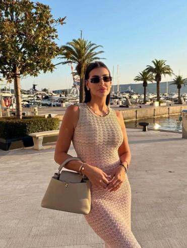 Nedavno je pozirala u elegantnoj kombinaciji – dugoj crnoj suknji sa visokim prorezom i beloj bluzi dubokog dekoltea. U ovom izdanju posebno su do izražaja došli njen bujni dekolte i tetovaža iznad grudi.