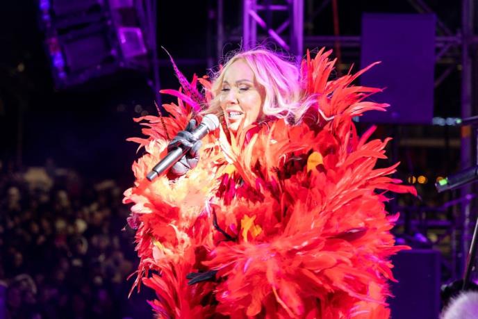Pevačica sa najvećim novogodišnjim honorarom na bini se pojavila u ekstravagantnom crvenom ogrtaču od perja, kojim je oduševila sve prisutne, a onda se preobukla u zanimljivu plavu kombinaciju u kojoj su dominirale bunda i šljokičave pantalone.