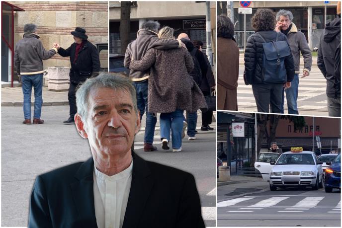 U jednom trenutku naišla je i njegova prijateljica. Čim su se ugledali, zastao je, prekinuo razgovor na telefonu i čvrsto je zagrlio. Taj susret bio je srdačan i iskren. Nakon nekoliko razmenjenih rečenica na pešačkom prelazu, razišli su se, jer je umetnik požurio da uđe u taksi koji je stajao parkiran.