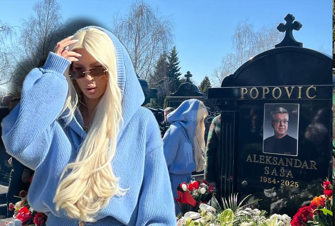 Jelena Karleuša stigla je na Bežanijsko groblje u svetloplavom vunenom džemperu s kapuljačom i trenerci. Pevačica je prvo prišla udovici i bacila joj se u zagrljaj. Nisu mogle da sakriju emocije i zaplakale su, tešeći jedna drugu. Karleuša je potom prišla spomeniku i poljubila sliku Saše Popovića, a potom se odvojila od drugih.