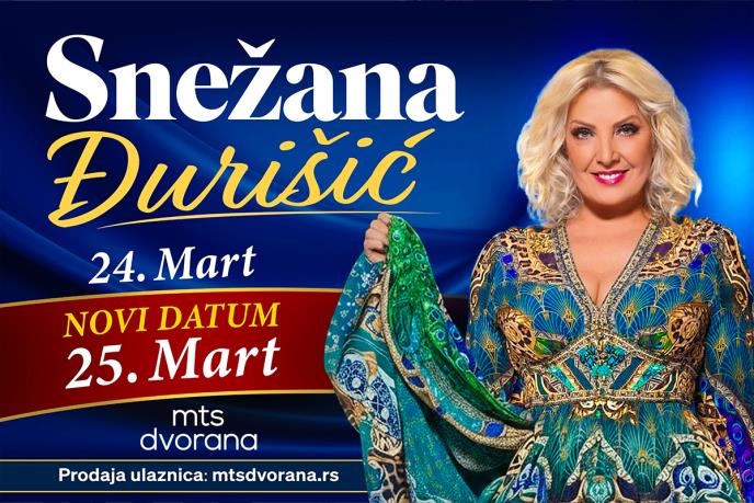 Jedna od najtalentovanijih i najbolјih pevačica na našim prostorima Snežana Đurišić održaće dva uzastopna solistička koncerta 24. i 25. marta u mts Dvorani, na mestu gde je i gradila svoje prve „muzičke korake“.  Karte za koncert se mogu nabaviti na mtsdvorana.rs i blagajni mts Dvorane.