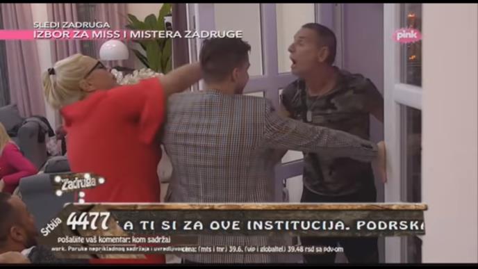 - Oćeš ku*ac da ti dam? Da ti zatvorim ta tvoja smrdljiva usta! Marš, svinjo! Marš, kosture! Ko si, bre, ti ovde da ustaješ i da pričaš kad ti hoćeš? Sedi dole, kosture! Šugo jedna, dođeš ovde da moju ćerku psuješ i da joj govoriš sve i svašta. Ološu jedan! Zato te svi mrze! Šugo jedan šugavi! M'rš, majmune, m'rš, majmune! Neće te žena, neće te ćerka, svi te isteruju odavde. Niko ne može da te gleda! - govorila je Marija, dok je obezbeđenje odvajalo pevača i Mariju.