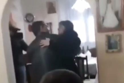 Ona je nosila crvenu haljinu sa šljokicama, a partner ju je preneo preko praga, što se vidi na video snimku.