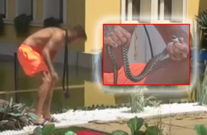 On je i danas uradio isto. On je danas pokraj bazena uhvatio zmiju dok ga je gledala Nataša Radan. Tom prilikom je on uhvatio zmiju za vrat i tako je nosio po imanju.