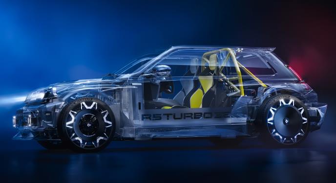 Iako ima jasne dizajnerske reference na R5 Turbo, Turbo 3E donosi potpuno unikatnu šasiju od aluminijuma i karbonskih vlakana, dok su prepoznatljive bočne ventilacione otvore prilagodili električnom pogonu – desna strana hladi kočnice, dok na levoj gornji otvor skriva punjač.