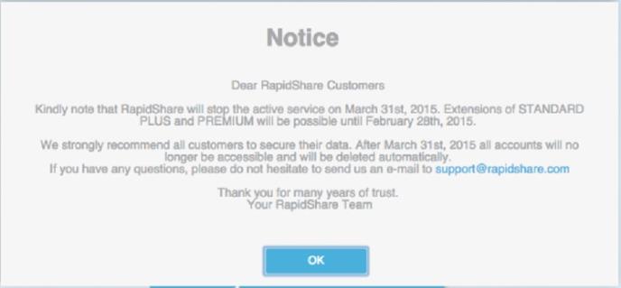 Švajcarska kompanija koja posluje još tamo od 2002. godine uistinu nam je ulepšala i olakšala život u samim počecima širenja interneta, ali pritisci sa svih strana, tužbe i rast konkurencije jednostavno su pregazili dobri, stari i verni RapidShare pa će on i službeno prestati sa postoji 31. marta 2015. godine. Tračak svetla u ovoj tužnoj vesti je činjenica kako su gazde ovog servisa odlučili da “iščupaju žicu” pod svojim uslovima, bez da su ih nasilno zatvorili nekakvim upadima specijalaca i zasipanjem milijonskim tužbama.
