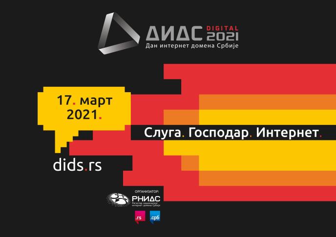 Jedna od najpoznatijih konferencija posvećenih internetu, koju od 2010. organizuje „Registar nacionalnog internet domena Srbije“ (RNIDS), prvi put će u potpunosti biti realizovana onlajn. Ove godine slogan DIDS konferencije nastoji da u tri reči sažme ulogu interneta u proteklih godinu dana: “Sluga. Gospodar. Internet.” Pratite nas uživo 17. marta od 10 časova na dids.rs, kada ćemo, uz pomoć izvanrednih predavača i panelista, razmotriti da li je privreda mogla imati boljeg slugu od interneta tokom pandemije, ali i zapitati se da li je internet nepovratno zagospodario praktično svim aspektima našeg života.