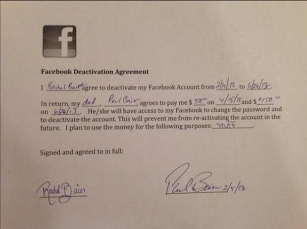 Paul Bajer sastavio je ugovor po kome se njegova ćerka Rejčel obavezuje da neće koristiti Fejsbuk do juna, a u zamenu dobija 200 dolara