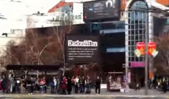 Bilbord je hakovan 8. marta na 22 minuta. U tom periodu na led ekranu su se smenjivale slike „The Pirate Bay“ i jedna od definicija “White-hat hackers”, a u jednom trenutku se na ekranu videla i igica.