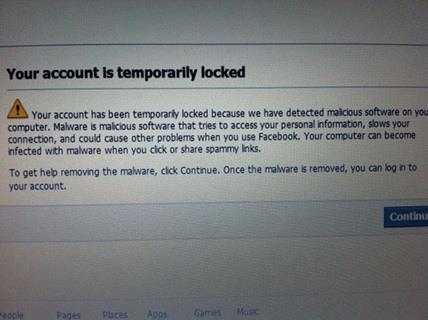 Ovih dana Fejsbukom cirkuliše lažno upozorenje da korisnici koji vide iskačući prozor sa obaveštenjem o privremenom zaključavanju naloga zbog otkrivenog malvera na računaru ne treba da kliknu na dugme "Continue" u prozoru jer će tako instalirati virus koji će obrisati sve podatke na računaru.
