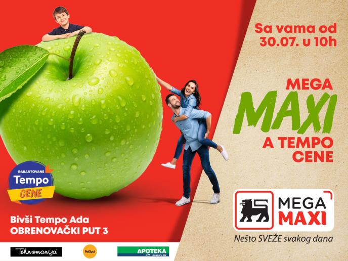 Na poznatom mestu, nekadašnjem Tempu Ada, kupci će moći da uživaju u novoj oazi porodične kupovine. Dobro poznati prostor je adaptiran i u potpunosti prilagođen potrebama modernog kupca koji želi da na jednom mestu pronađe sve artikle, a da istovremeno uživa u nabavci. U hipermarketu Mega Maxi, koji za kupce otvara vrata 30. jula na dobro poznatoj adresi Obrenovački put broj 3, biće dostupni proizvodi po jedinstvenim Tempo cenama.