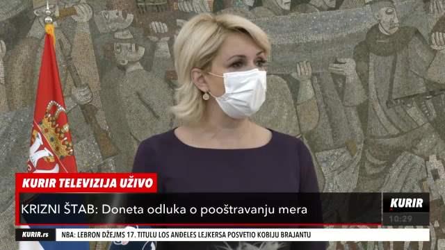 "Donete su oštrije mere, maske su obavezne i na otvorenom, a zabranjuju se slavlja" izjavila je posle sednice Kriznog štaba Prof. dr Darija Kisić Tepavčević, epidemiolog i zamenik direktora Instituta za javno zdravlje Srbije "Dr Milan Jovanović Batut".