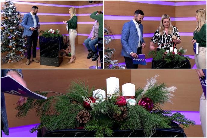 U sunđer umetnite grančice, poređajte i šišarke od jelke, ili šta vam drugo padne na pamet, simetrično, a simetrično poređajte i sveće. Najlepše bi bilo da stavite tri.
