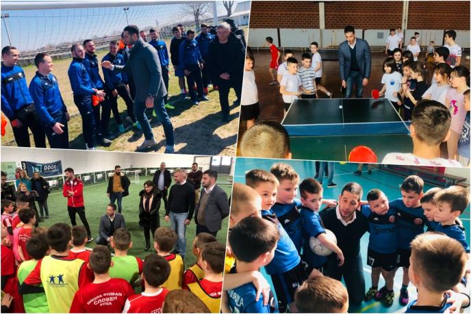 Ministar Udovičić se družio sa mladim sportistima Omladinskog fudbalskog kluba “Zeka Buljubaša” iz Ravnja, Fudbalskog kluba “Sremski vitezovi – Radnički” iz Iriga, kao i sa fudbalerima GFK “Sloven” koje je posetio u Sportskom centru “Gymnasium” u kom treniraju i svima uručio nove komplete sportske opreme.
