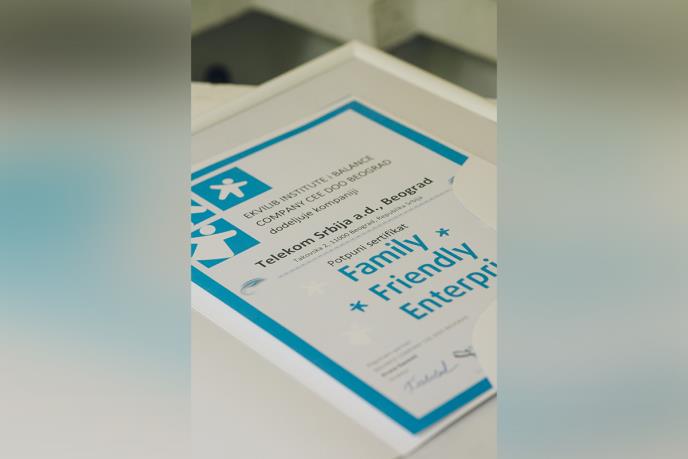 Kompanija Telekom Srbija postala je nosilac potpunog Family Friendly Enterprise sertifikata nakon uspešne realizacije trogodišnjeg postupka kreiranja porodično odgovornih politika i primene benefita usmerenih na uspostavljanje veće ravnoteže između poslovnih obaveza i privatnog života zaposlenih.