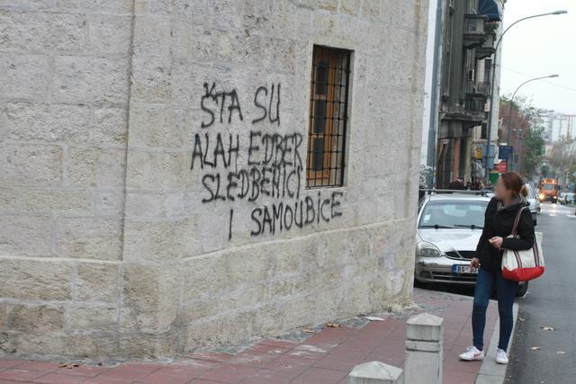 Nepoznate osobe napisale su crnim sprejom na tom spomeniku "Nek u paklu gore", i "Jel ovo Bin Ladenov sanduk unutra", uz uvrede na račun muslimana. Gradske komunalne službe izbrisale su u toku dana te grafite.