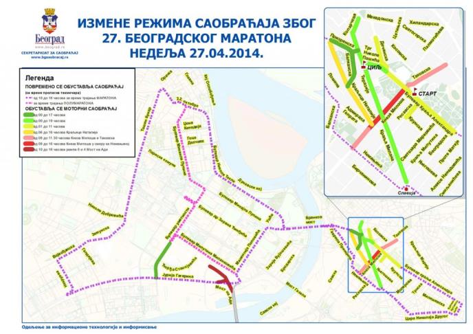 • od ponoći do 19 časova obustavlja se motorni saobraćaj u Kolarčevoj, na Terazijama, u Kralja Milana, kao i na delu Trga Nikole Pašića prema Terazijama;• od ponoći do 17 časova obustavlja se motorni saobraćaj u Prizrenskoj i delu Balkanske ulice (od Prizrenske do Ulice kraljice Natalije), kao i na saobraćajnicama u zoni OTC „Novi Beograd”;• od 1 do 11 obustavlja se saobraćaj u Dečanskoj, na delu od Nušićeve do Trga Nikole Pašića, na Trgu Nikole Pašića, Bulevaru kralja Aleksandra (od Kneza Miloša do Beogradske ulice) i u Resavskoj (na delu od Krunske do Bulevara kralja Aleksandra);• od 9 do 11.30 zatvara se motorni saobraćaj u Takovskoj (od Svetogorske do Kneza Miloša) i Kneza Miloša (od Takovske do Nemanjine ulice). Ulica Kneza Miloša na delu od Bulevara kralja Aleksandra do Admirala Geprata, smer ka Nemanjinoj, ostaje zatvorena za saobraćaj do 16 časova;• od 10 do 16 zatvara se za motorni saobraćaj trasa maratona: Bulevar kralja Aleksandra, Ulica Branka Krsmanovića, Cara Nikolaja II, Makenzijeva, Trg Slavija, Nemanjina, Balkanska, Gavrila Principa, Pop Lukina, Brankov most, Bulevar Mihajla Pupina (od Brankovog mosta do Bulevara N. Tesle), Bulevar Nikole Tesle, Karađorđev trg, 22. oktobra, Vrtlarska, Ivićeva, Tošin bunar, Zemunska, Vojvođanska, Nehruova, Jurija Gagarina (kolovozna traka za smer ka Dr Ivana Ribara, na delu od Milutina Milankovića (III bulevara) do Dušana Vukasovića), Milutina Milankovića (III bulevar), Milentija Popovića, Brankov most, Kraljice Natalije, Aleksandra Dubčeka, Bulevar Mihajla Pupina u delu od Aleksandra Dubčeka do Bulevara umetnosti, Bulevar umetnosti, Bulevar Zorana Đinđića u delu od Omladinskih brigada do Bulevara umetnosti, Milutina Milankovića (od Bulevara umetnosti do Milentija Popovića), kao i svi prilazi trasi, uključujući i delove trase koji su ranije zatvoreni iz organizacionih razloga. Zatvaranje za saobraćaj vršiće se u skladu sa dinamikom prolaska takmičara; • od 6 do 16 zabranjuje se motorni saobraćaj i treba da se uklone sva vozila koja nisu u funkciji održavanja maratona u Ulici kraljice Natalije;• od 10 do 16 zatvara se za motorni saobraćaj rampa 6 i 4 na Mostu na Adi;