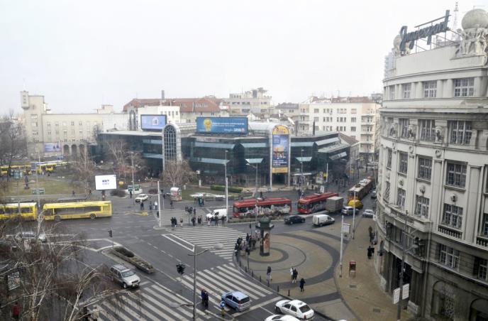 BEOGRAD - Usled naleta vetra, parče staklene fasade palo je danas oko 14.10 sati sa TC "Staklenac" na Trgu republike.