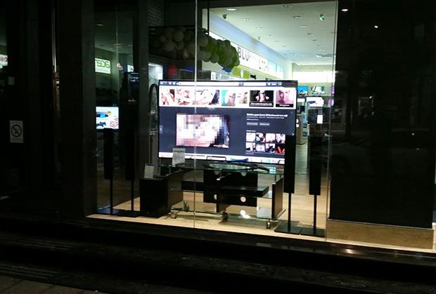 Naime, na televizorima ponuđenim na prodaju u izlogu radnje u najstrožem centru Beograda na Terazijama, na samom početku Knez Mihailove, umesto promo snimaka koji svedoče o kvalitetu uređaja, "zavrteli" su se porno snimci, a mnogi Beograđani su tu neobičnu situaciju zabeležili svojim mobilnim telefonima.